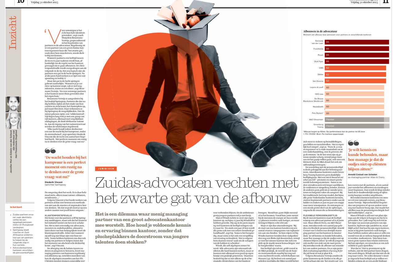 Nieuw perspectief voor ‘senior partners’ in de wildernis. Wat betekent het voor mij persoonlijk als ik uittreed als partner? Wie ben ik als ik geen advocaat meer ben? Hoe wil ik mijn praktijk afbouwen en overdragen? En wat ga ik doen in die volgende levensfase? In “Verder dan de Top” staan deze vragen centraal tegen het decor van een wildernistrail in Zuid-Afrika.